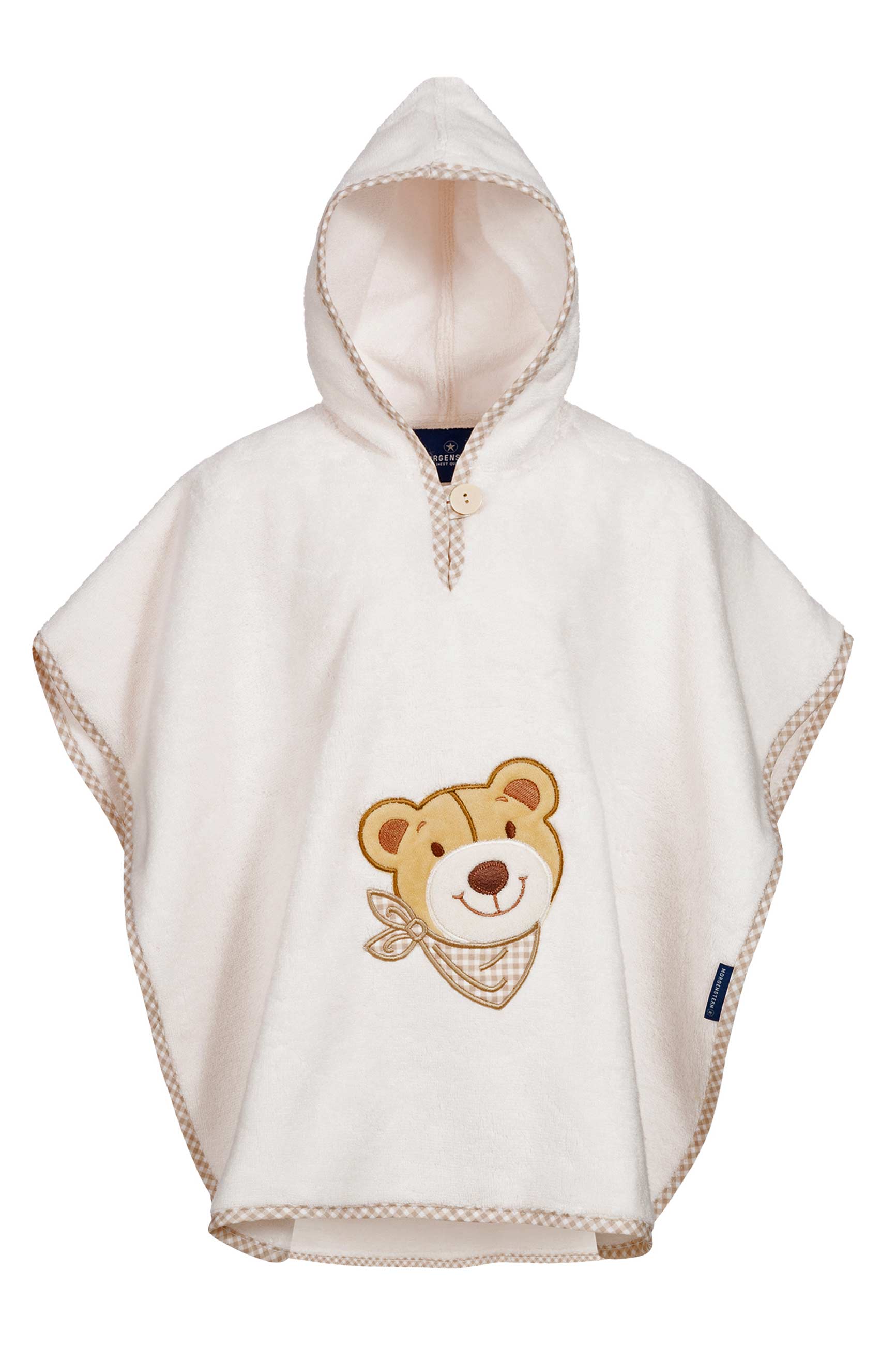 Badeponcho mit Kapuze und Knopf mit niedlicher Bären-Applikation auf der Vorderseite. Besonders kuschelige Luxus-Frottierware mit Vichy-Karo Paspel von Morgenstern. Material: 100 % Luxus Baumwolle. Auf Schadstoffe geprüft: STANDARD 100 by OEKO-TEX®.