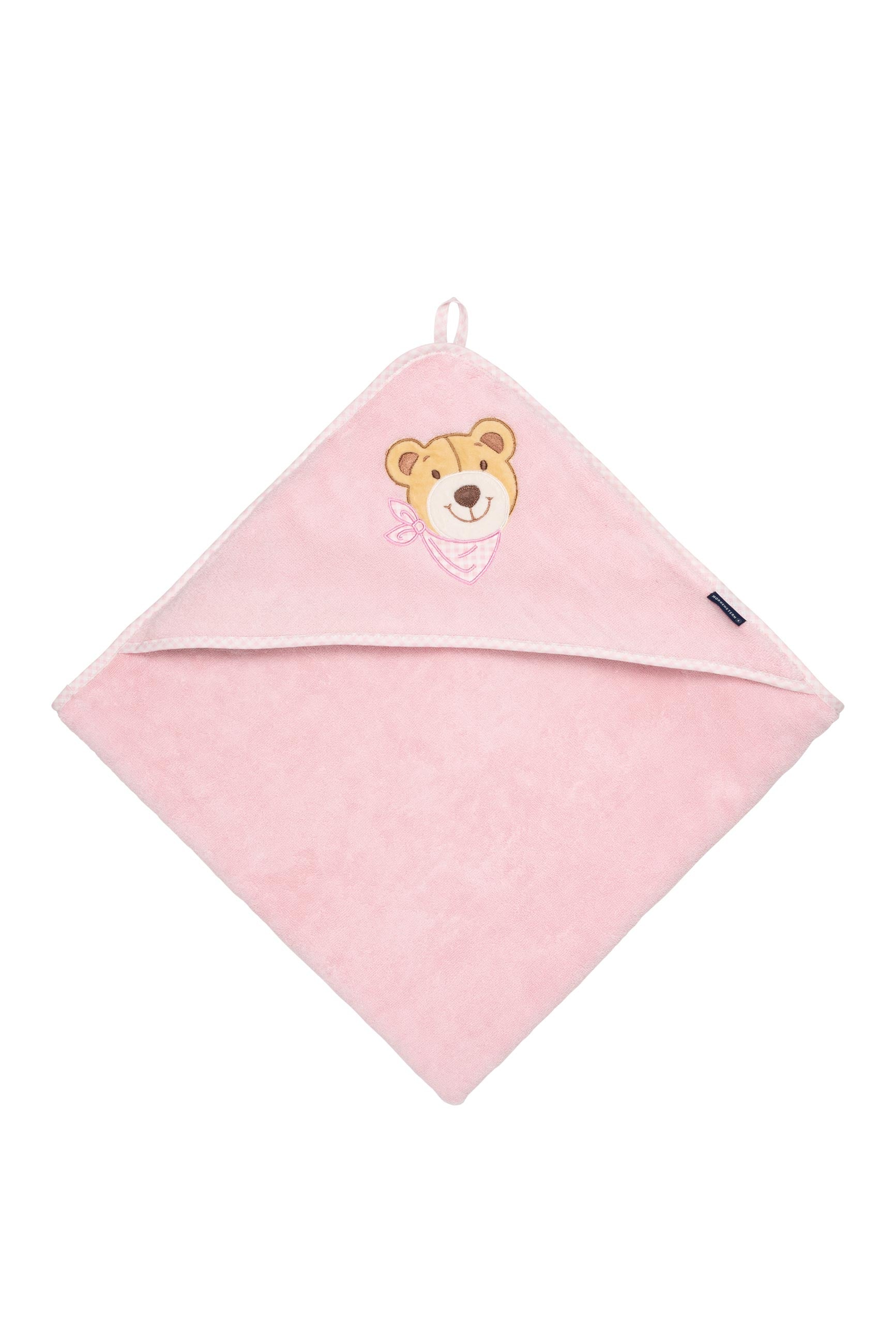 Hochwertiges Kapuzenlaken mit niedlicher Bären-Applikation auf der Kapuze. Kuschelige Luxus-Frottierware mit Vichy-Karo Paspel von Morgenstern. Material: 100 % Luxus Baumwolle. Auf Schadstoffe geprüft: STANDARD 100 by OEKO-TEX®.