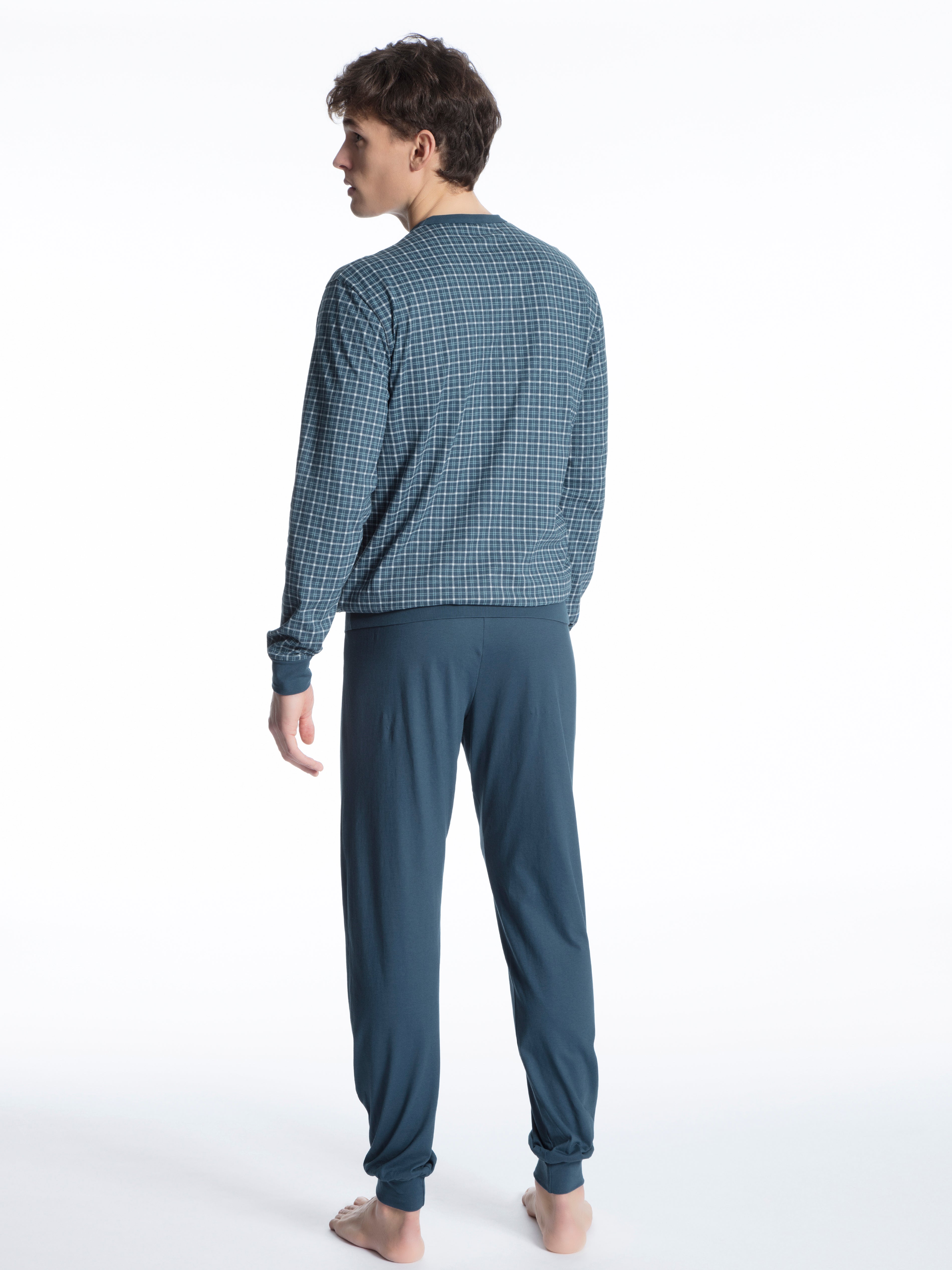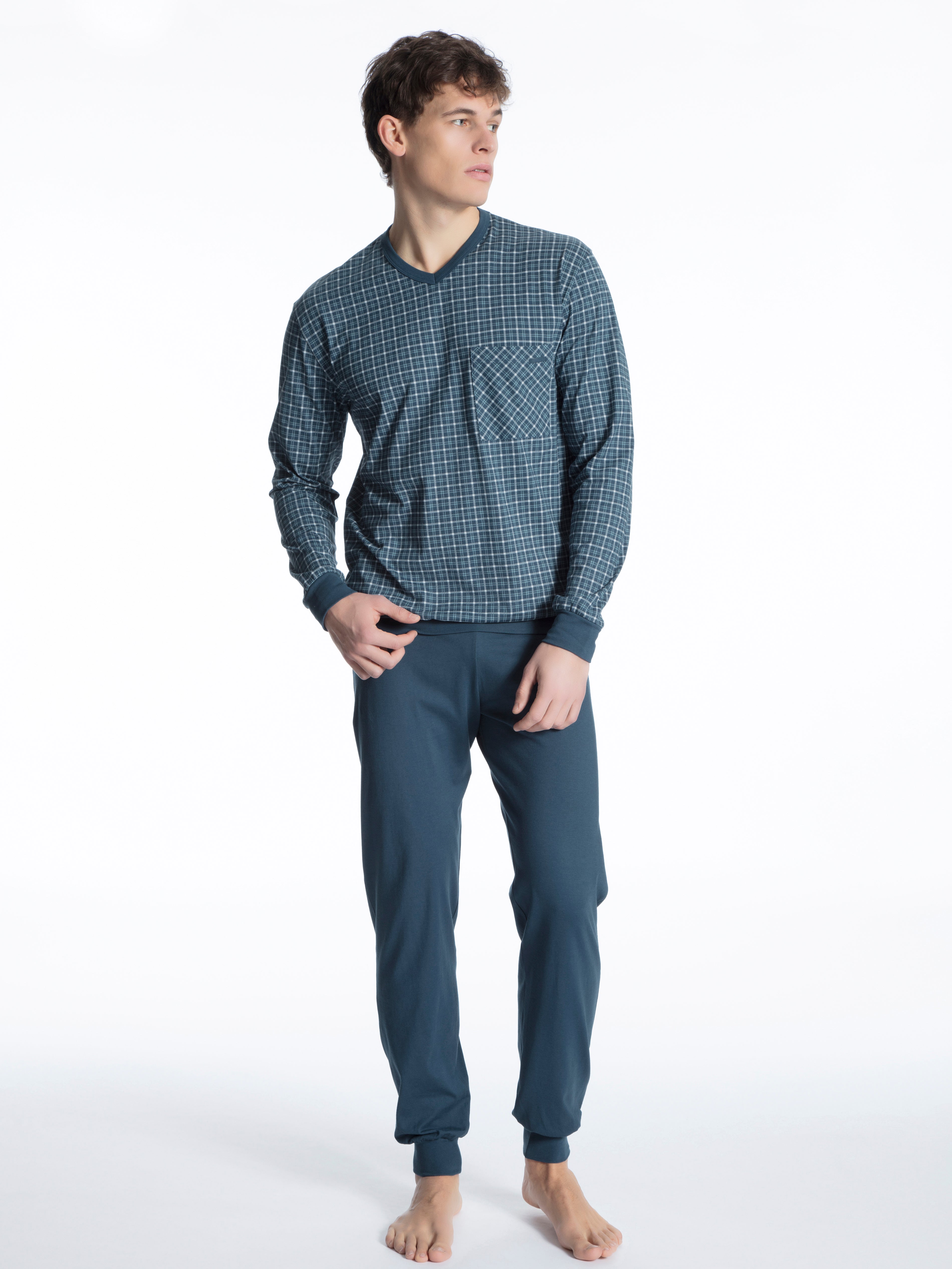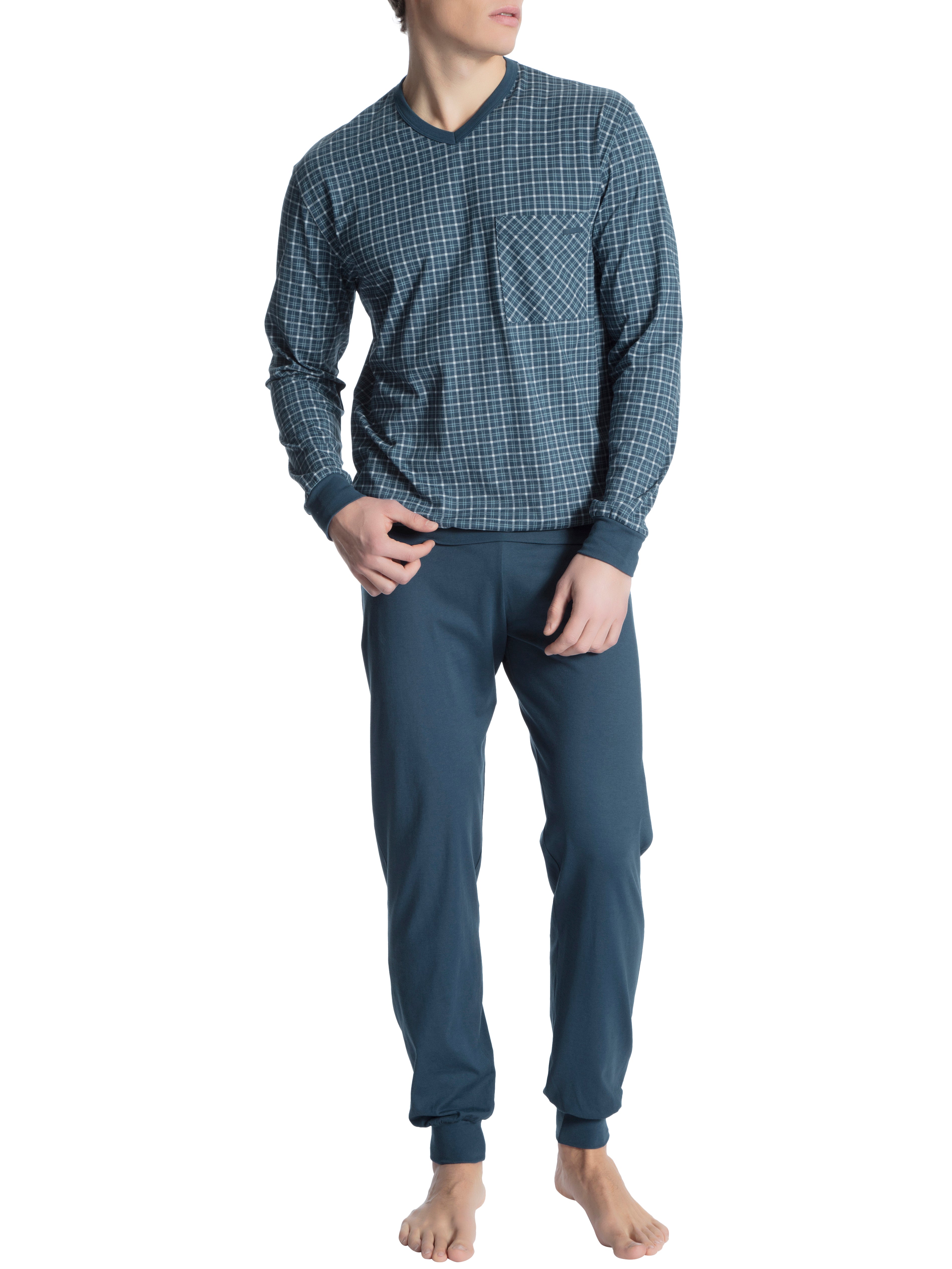 Pyjama mit Bündchen|im Comfort Fit|aus reiner Baumwolle|in Single Jersey-Qualität|feine, glatte Oberfläche|gemustertes Oberteil mit V-Ausschnitt|mit aufgesetzter Brusttasche|lange, unifarbene Hose|mit stoffbezogenem Gummibund
