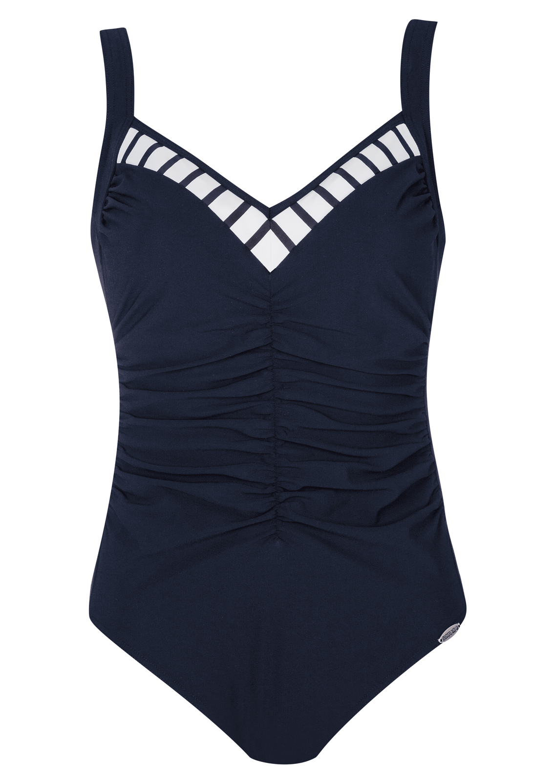 Ein Klassiker im maritimen Look: Unwiderstehlicher Badeanzug mit sagenhafter Passform in Tiefblau mit Weiß. Hoher Tragekomfort dank Softschalen. Besonders trage- und figurfreundlich durch die leichten Raffungen im vorderen Bereich. Tiefer Rückenausschnitt.
