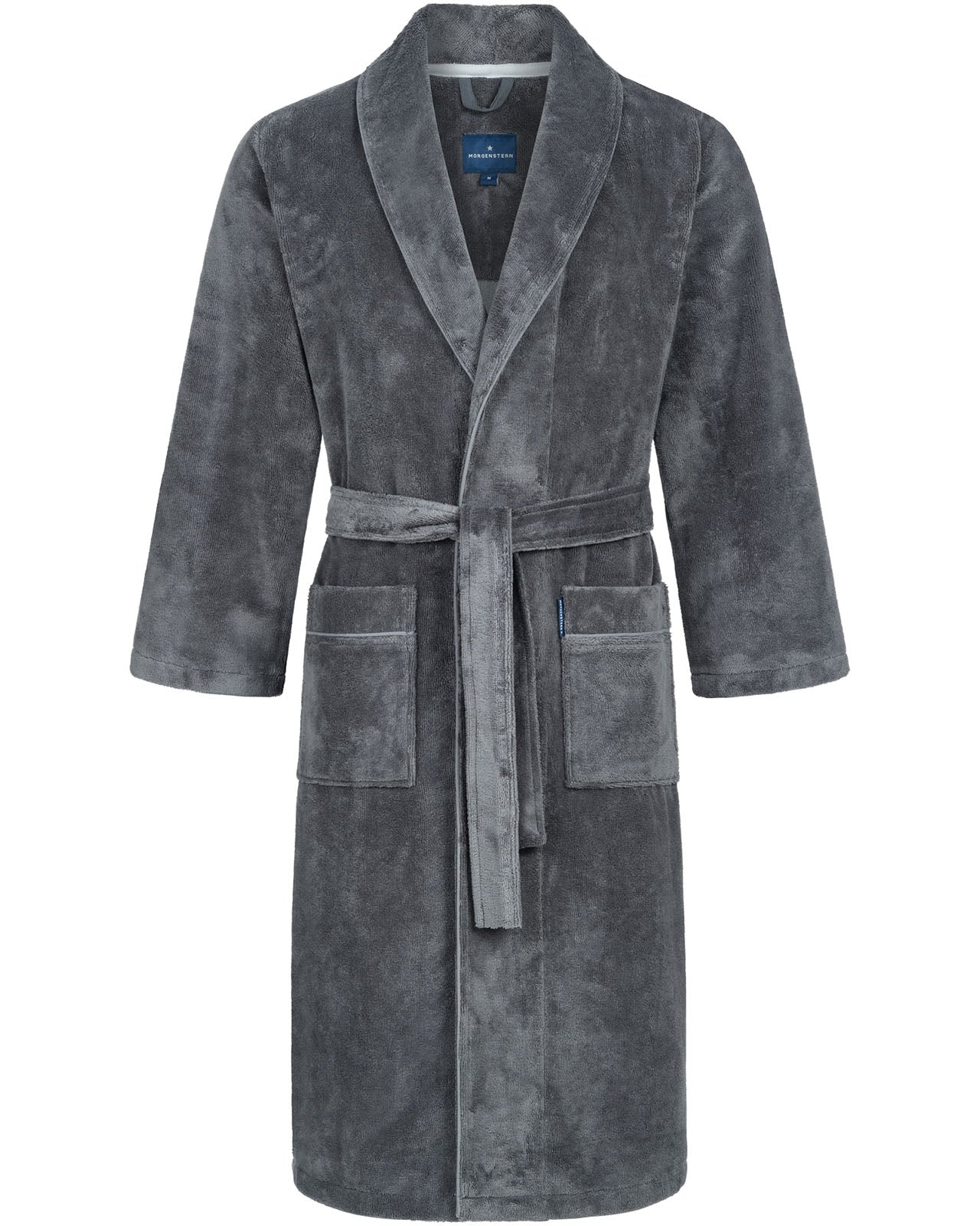+ Schalkragen mit Biese, Bindegürtel, 2 aufgesetzte Taschen, 1 Reißverschluss-Innentasche, Aufhänger