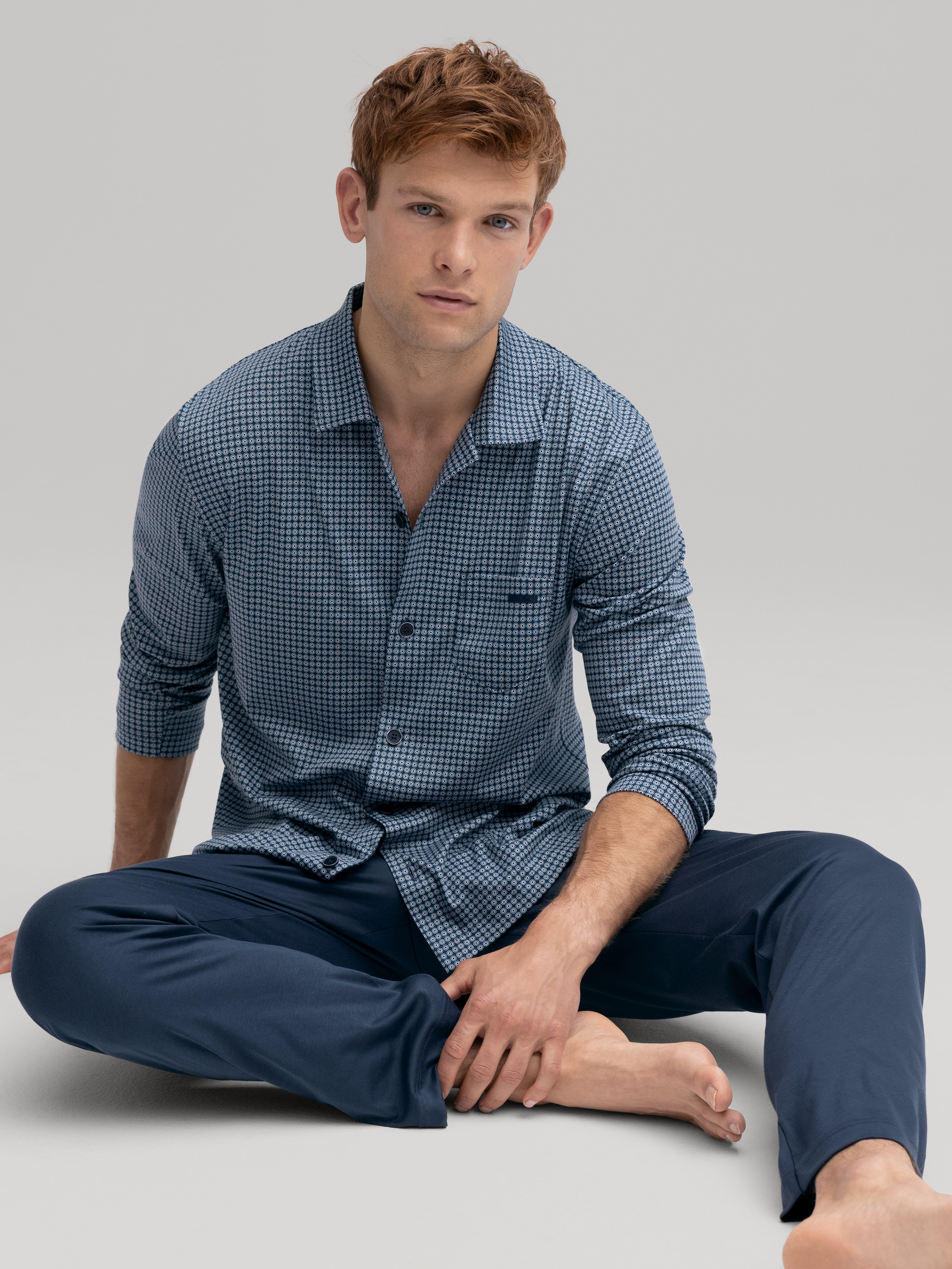 Made from 100% cotton|naturally breathable and soft|stretchy interlock weave|top with a patch-style breast pocket and shirt collar|pants with a fabric-covered elastic waistband|elegant look with a stylish pattern