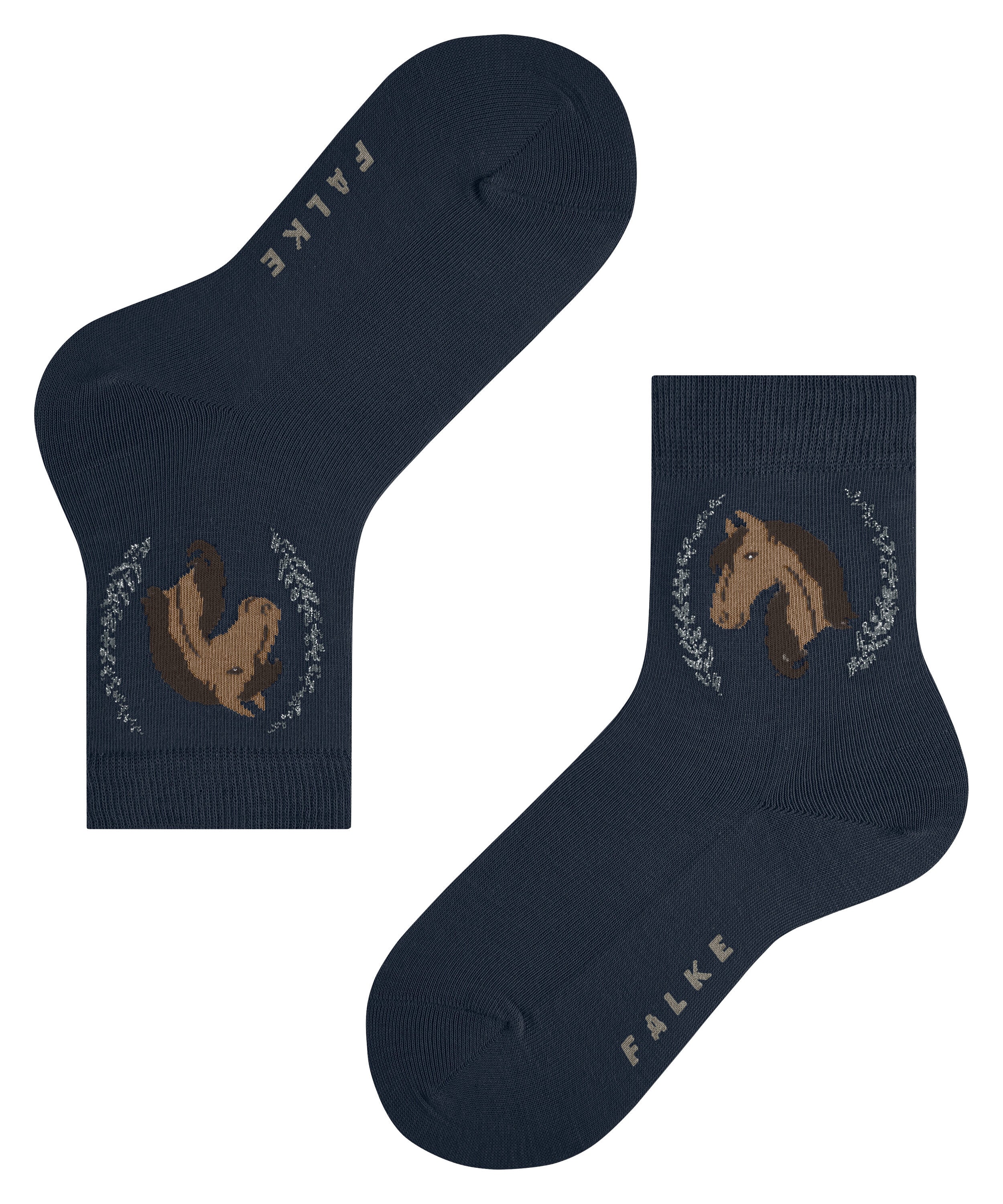 Dieser mädchenhafte Kinder-Strumpf mit einzigartigem Pferde-Motiv ist ein absolutes Highlight für Reiterinnen und jeden Pferdeliebhaber. Der schöne Pferdekopf wird umrandet von einem glitzernden Sieger-Lorbeerkranz. Die nachhaltige Qualität aus besonders hautschmeichelnder und pflegeleichter Baumwolle, FALKE – WE CARE – COTTON, bietet ergänzend zu der perfekten FALKE-Passform ein optimales Tragegefühl.